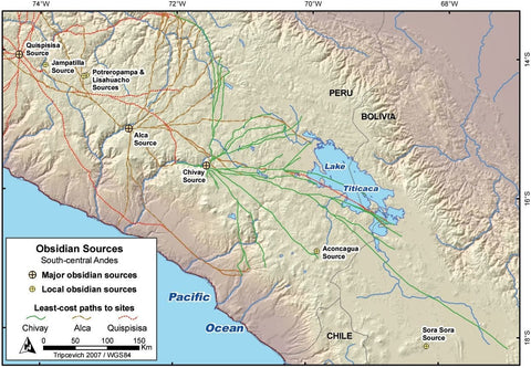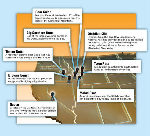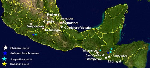 Les sources d'obsidiennes en Mésoamérique sont limitées en nombre et en répartition. Elles sont confinées aux régions de la cordillère néovolcanique, de la sierra madre orientale et de la sierra madre de chiapas, dans le centre du Mexique et au Guatemalr. Ces ressources sont cependant très abondantes dans les ensembles archéologiques et leur origine peut être retracée par leurs propriétés physiques et géologiques.