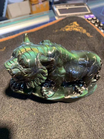 Lorsque des cristaux microscopiques de feldspath ou de mica sont formés le long de la coulée de lave et incluses dans l’obsidienne sous forme lamellaire, la lumière, pénétrant tour à tour deux matières différentes, l’obsidienne et le feldspath, produit une interférence donnant ce jeu de couleurs dit non spectrale.