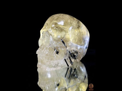 Type : Crâne en cristal de roche a inclusions de tourmalines – sculpture artisanale exceptionnelle