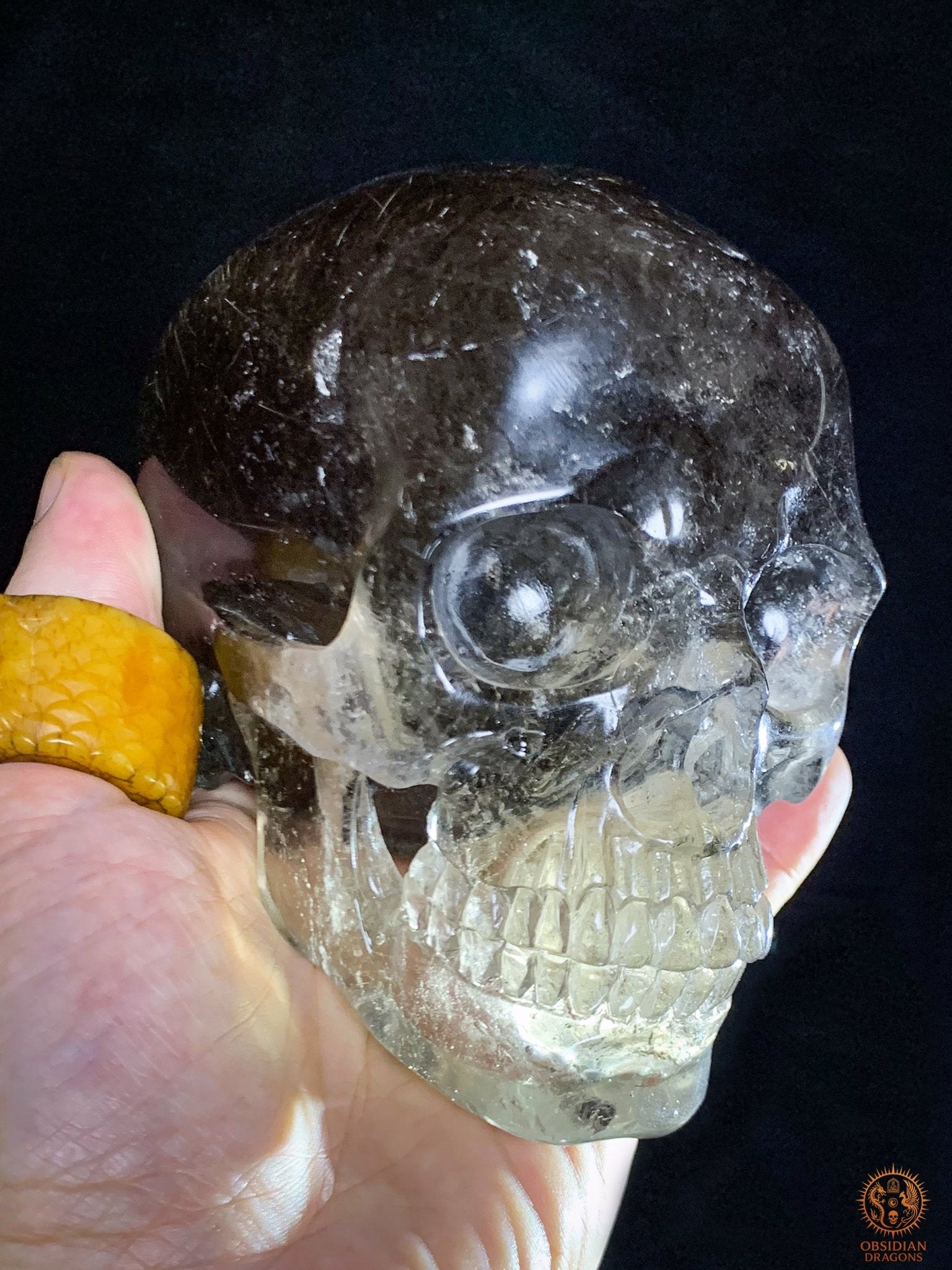 Ce Crâne de Cristal en Quartz Rutile Fumé est une véritable pièce d’exception.