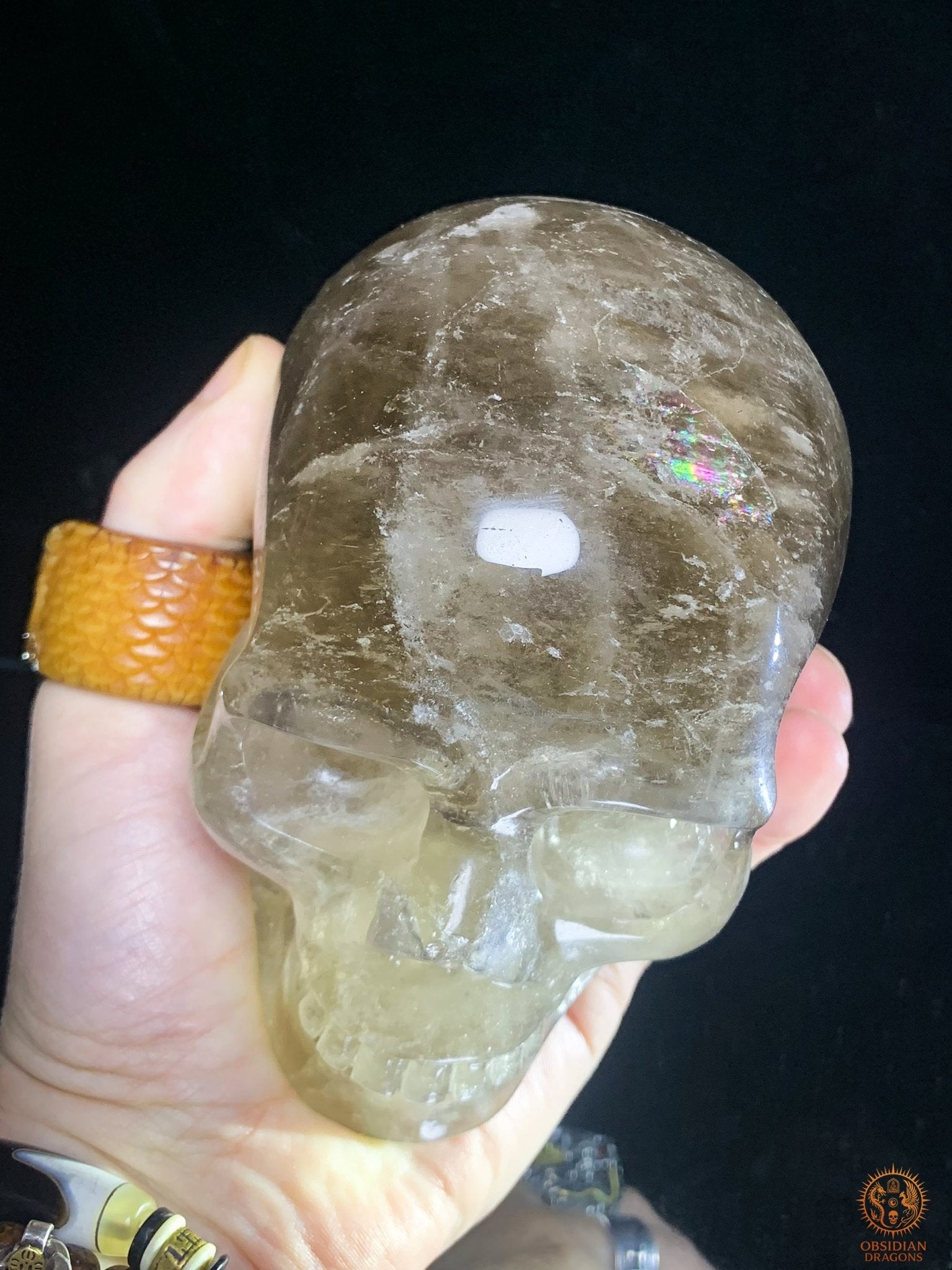 Crâne de Cristal Quartz Fumé Naturel – Reflets Arc-en-Ciel
