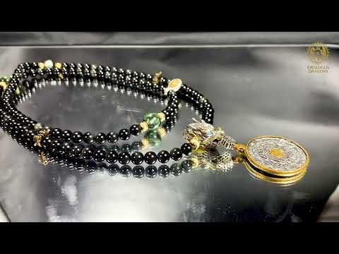 La présence d’une tête de dragon en argent 925 plaqué or 24K, sertie de turquoises naturelles, du médaillon Feng Shui Bagua Luo Pan avec les Neuf Palais Célestes, ainsi que des dragons rituels et du nœud de l’infini en argent, fait de ce mala une véritable œuvre d’art spirituelle. Associant l’obsidienne œil céleste du Mexique et la séraphinite de Sibérie, il incarne un équilibre parfait entre protection tellurique et élévation céleste.