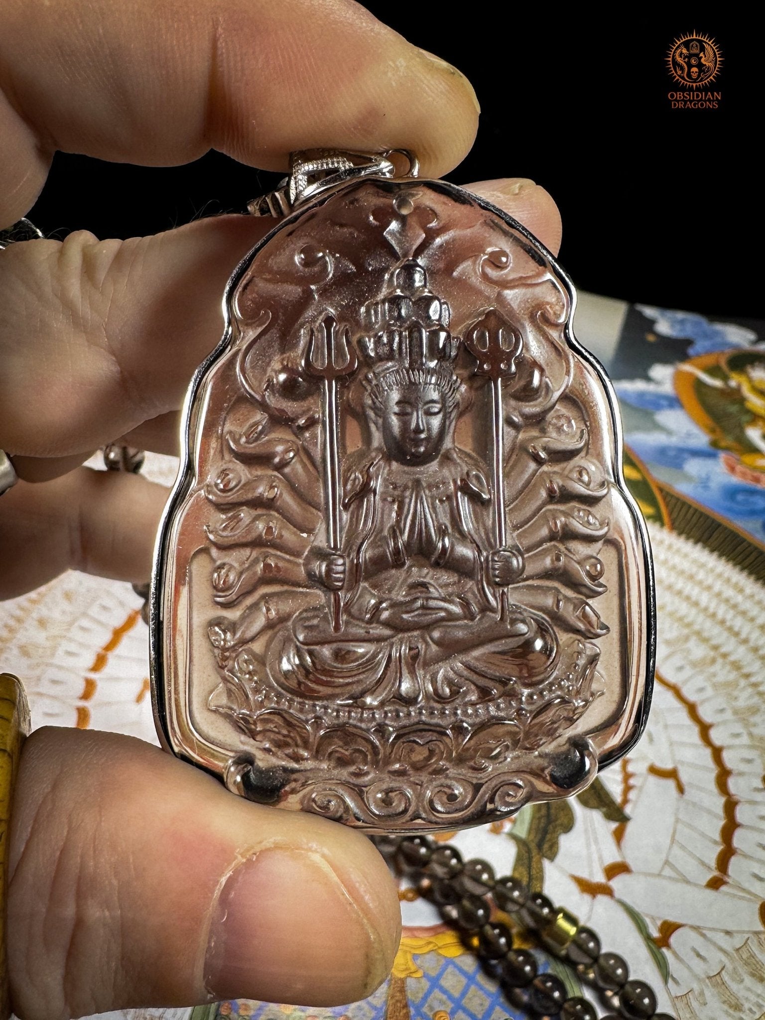 🔹 Pendentif Chenrezig à mille bras – Obsidienne glace translucide & argent 925 (Dédicace du mala)