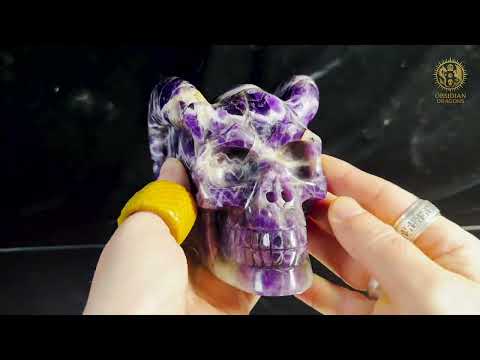 Crâne Cornu en Améthyste Chevron du Brésil – Totem des Dieux Anciens, Sculpture Lapidaire Artisanale en Quartz, Crâne Mythologique de Collection Minérale, Méditation et Cabinet de Curiosités.