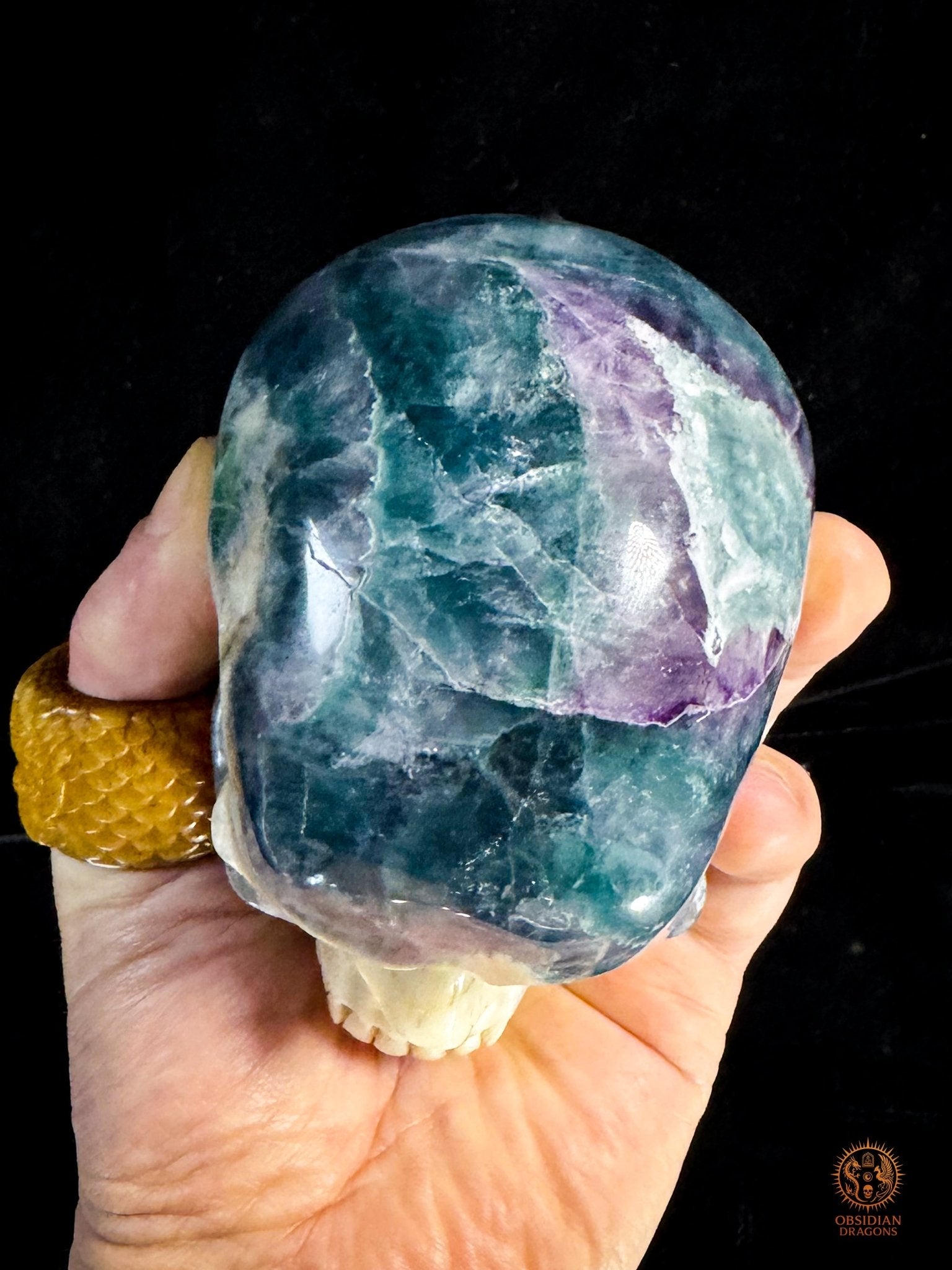 Ce Crâne en fluorite constitue ainsi un véritable document géologique tridimensionnel, où matière carbonatée et cristal halogéné dialoguent sans artifice. La sculpture ne dissimule pas cette histoire : elle la révèle. Chaque contraste de densité et chaque variation de couleur est le résultat direct de centaines de milliers, voire de millions d’années de cristallisation progressive, aujourd’hui figées dans une œuvre d’art minéral authentique.