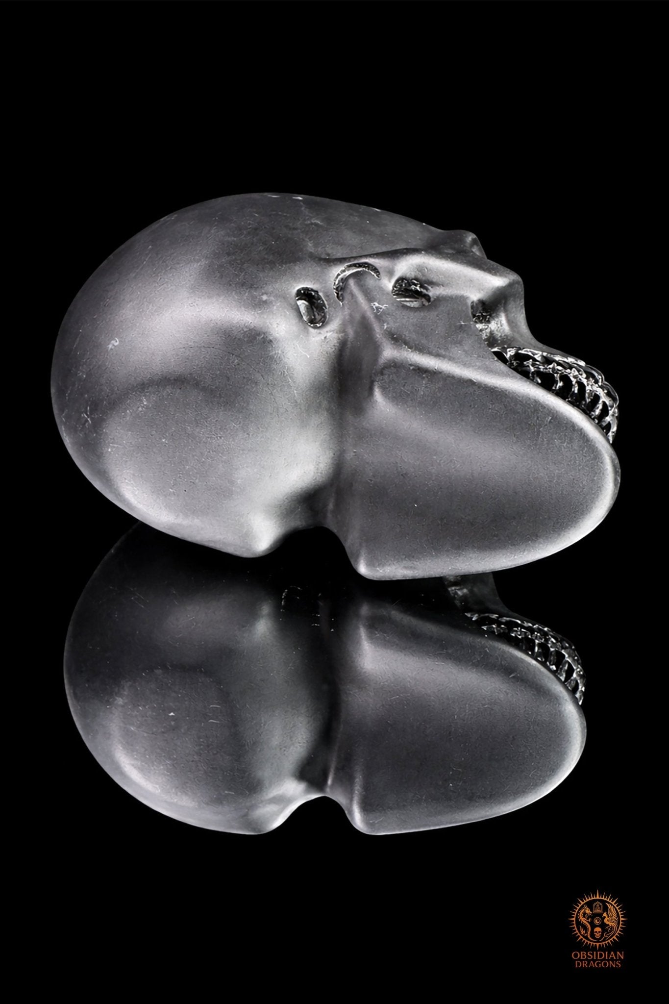 Pour ce Crâne en obsidienne noire, l’hyper réalisme renforce cette lecture. L’anatomie précise, la dentition détaillée, les volumes respectés rendent la présence presque biologique.