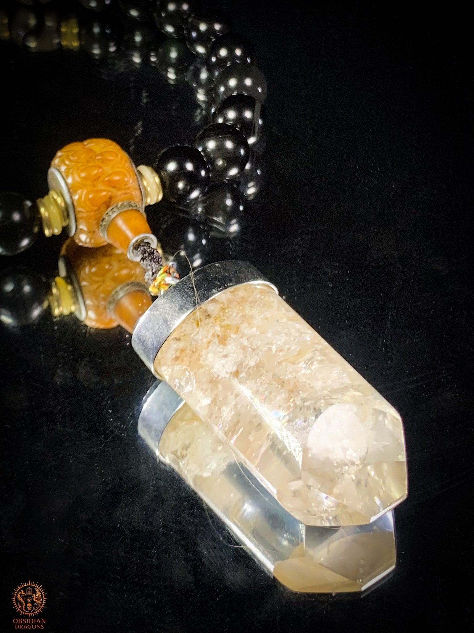 Ce Mala Bouddhiste unique unit la puissance tellurique de l’obsidienne œil céleste à la clarté du cristal de roche naturel, soutenue par la puissance des perles Dzi tibétaines.