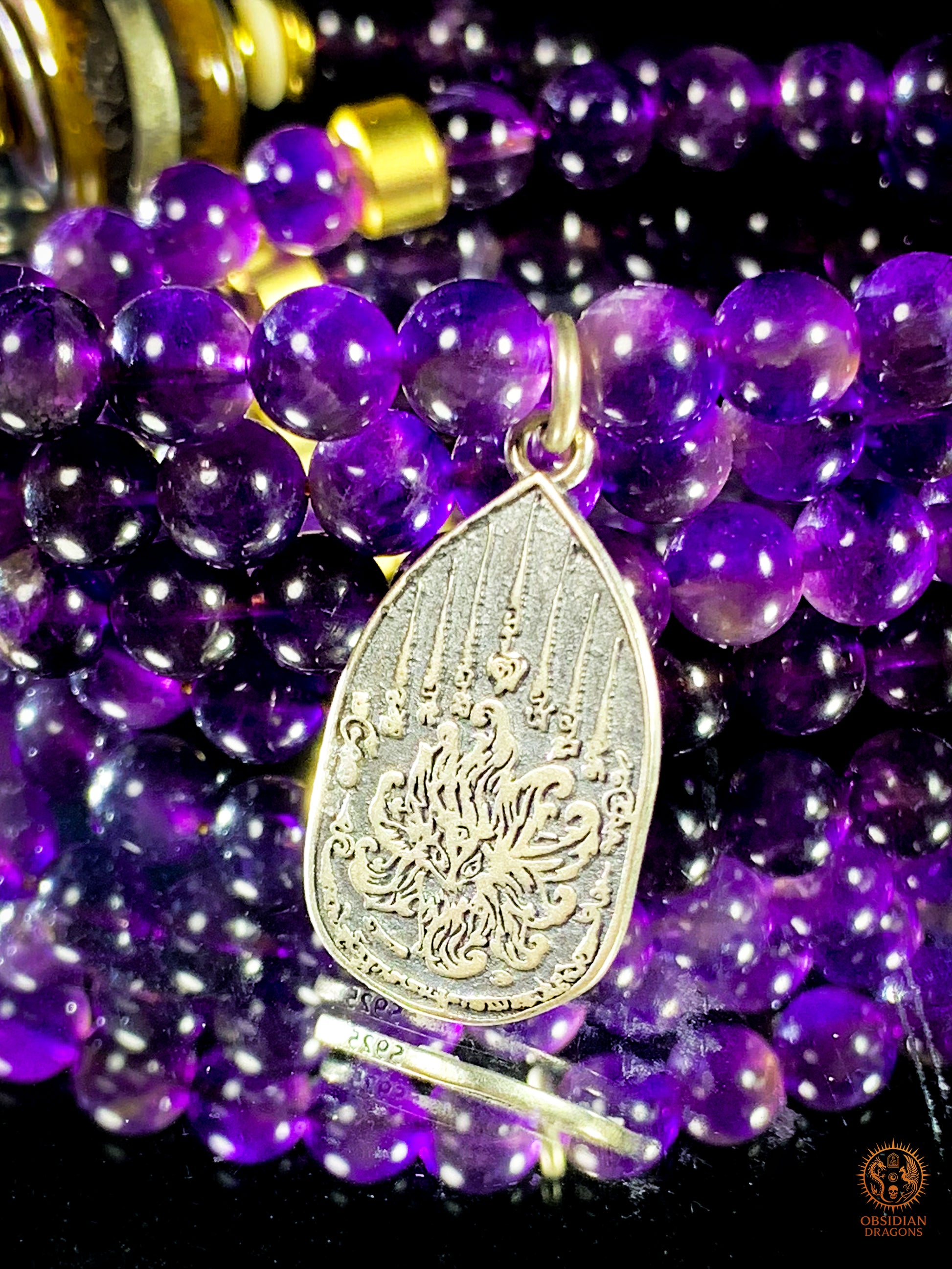 Il relie la sagesse apaisante de l’améthyste à la bienveillance du Yant Dok Mai Sawan, créant un axe d’énergie unissant la paix intérieure et la prospérité consciente.