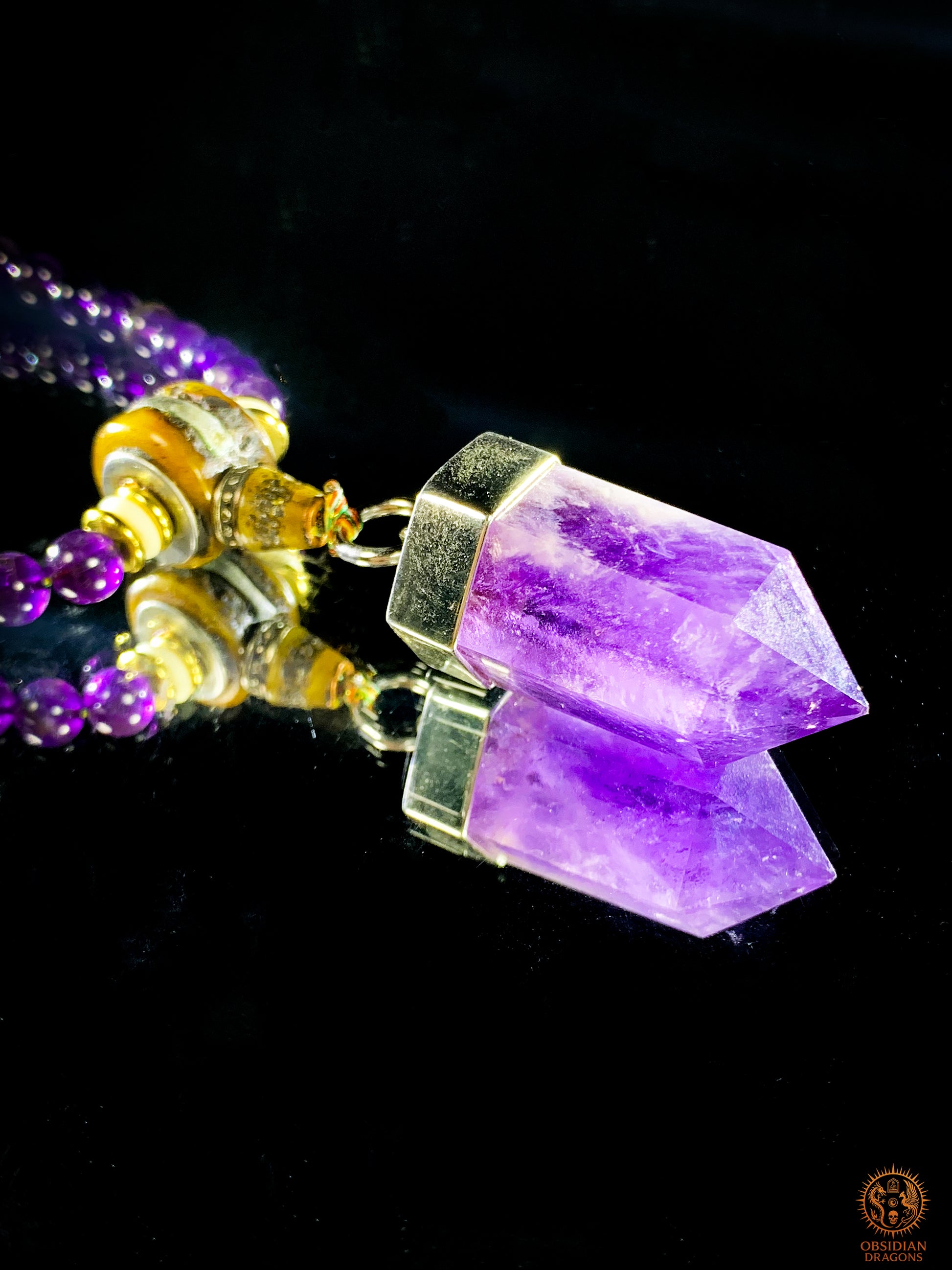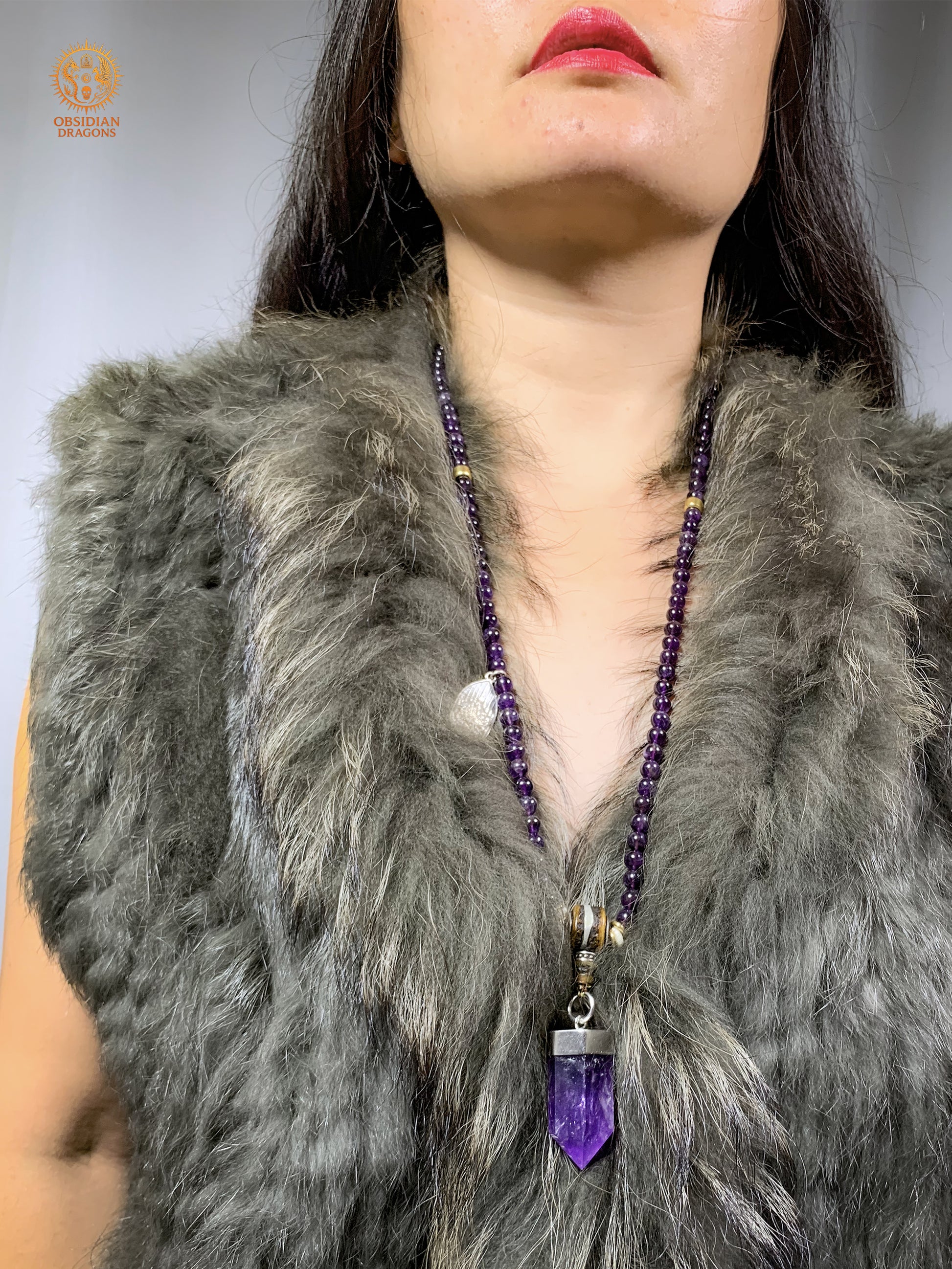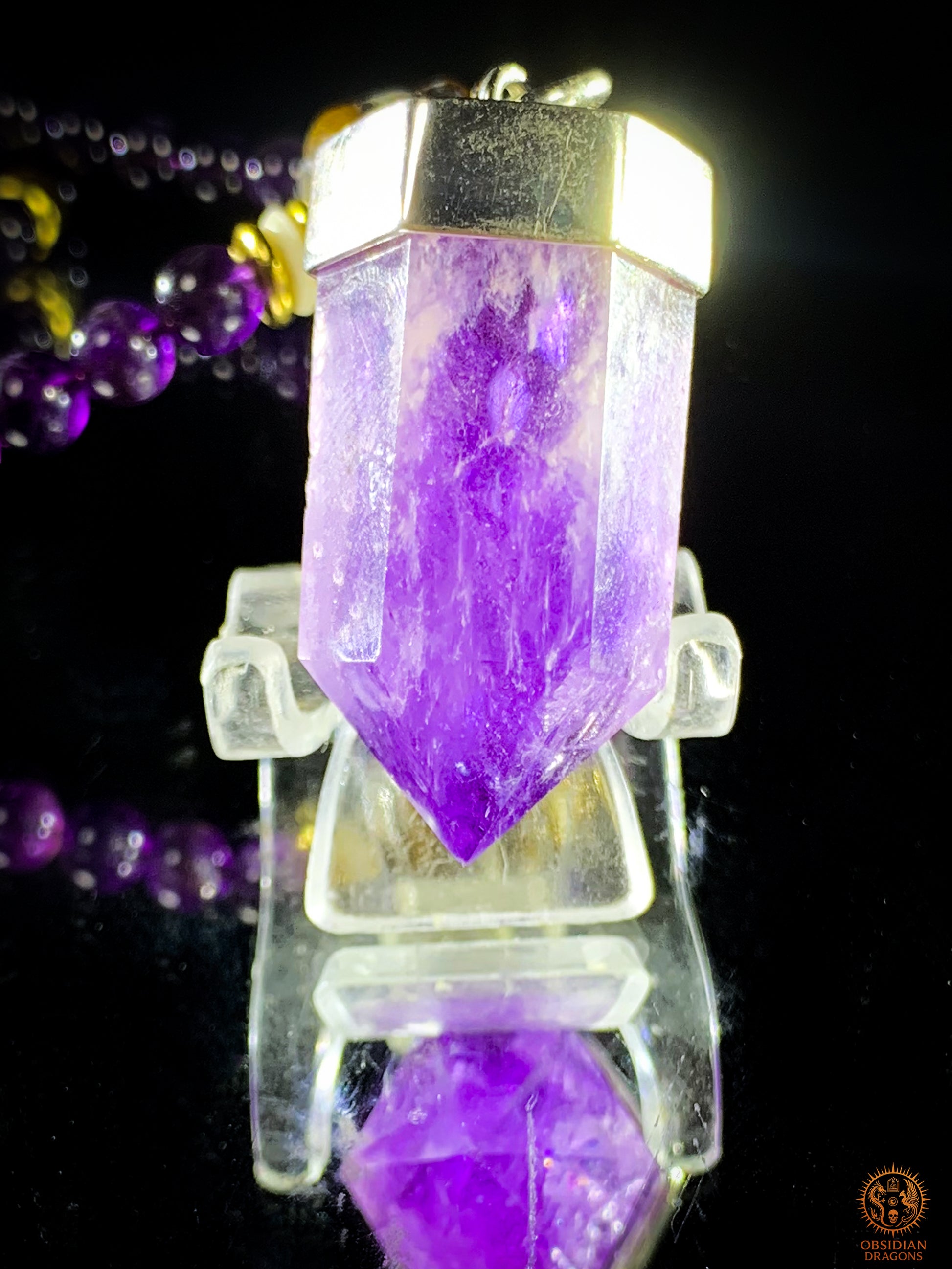 La pointe d’améthyste du Brésil, sertie à la main sur argent 925 plaqué or blanc, est le sommet énergétique du Mala en Améthyste.