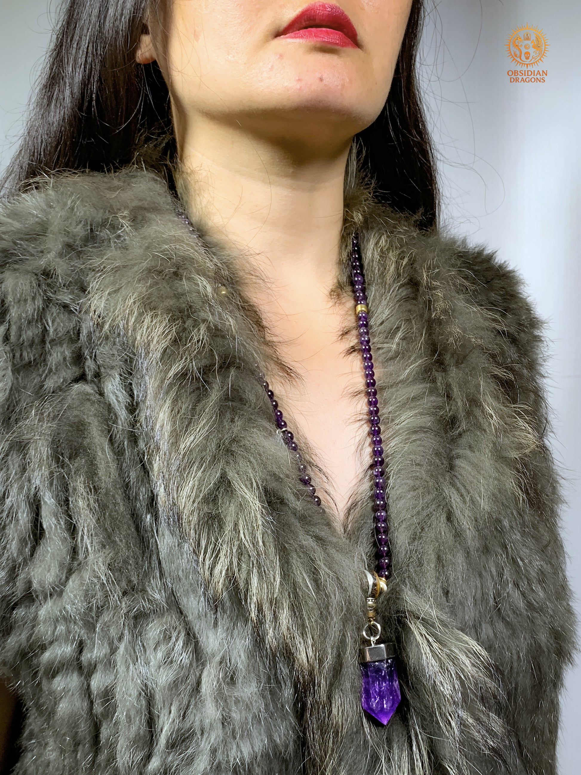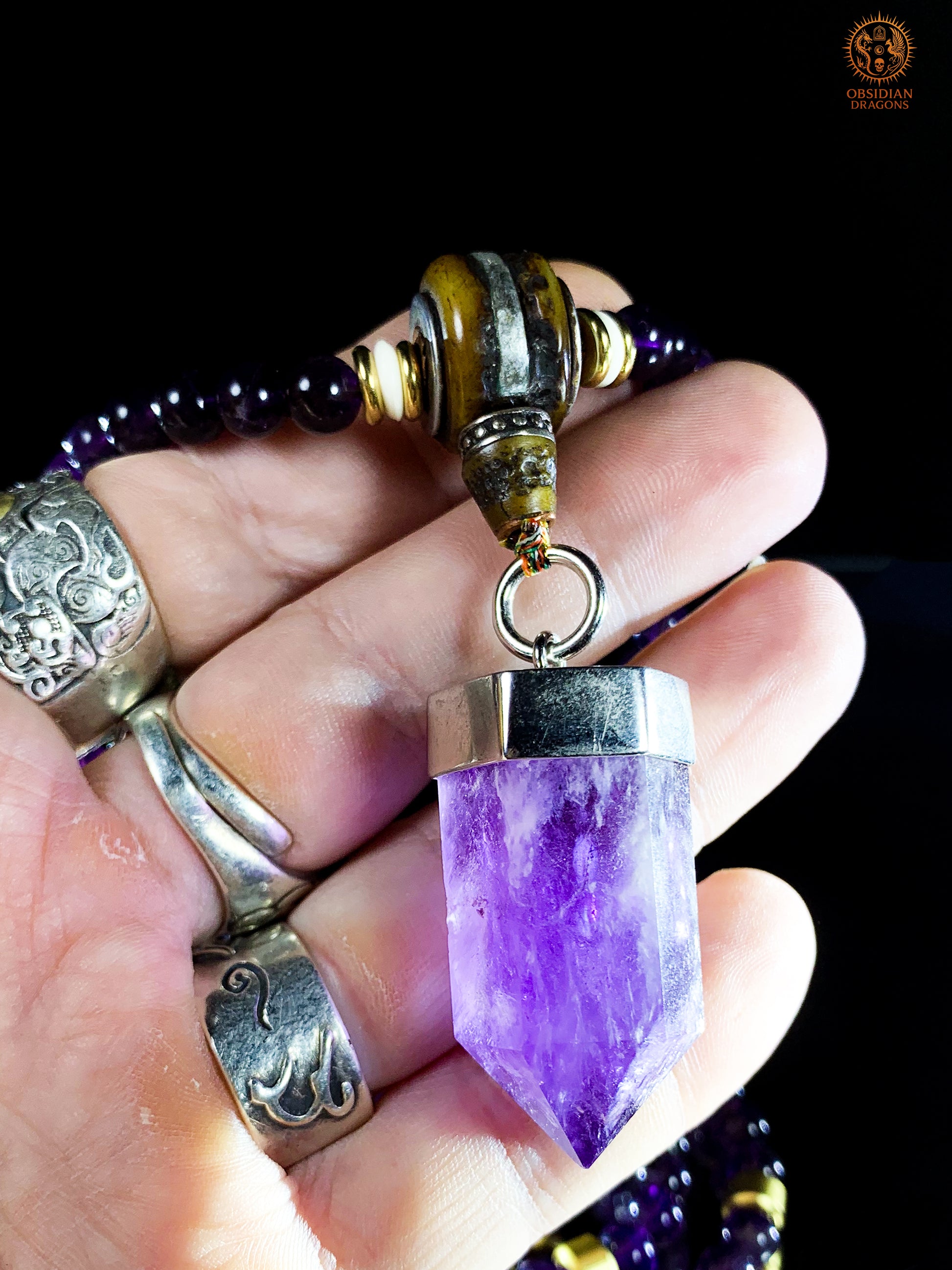 J’ai associé à ce Mala en Améthyste une pointe d’améthyste du Brésil, taillée dans la pureté cristalline, symbole d’unité et de discernement. Elle prolonge le souffle intérieur et canalise la vibration méditative du mental apaisé.