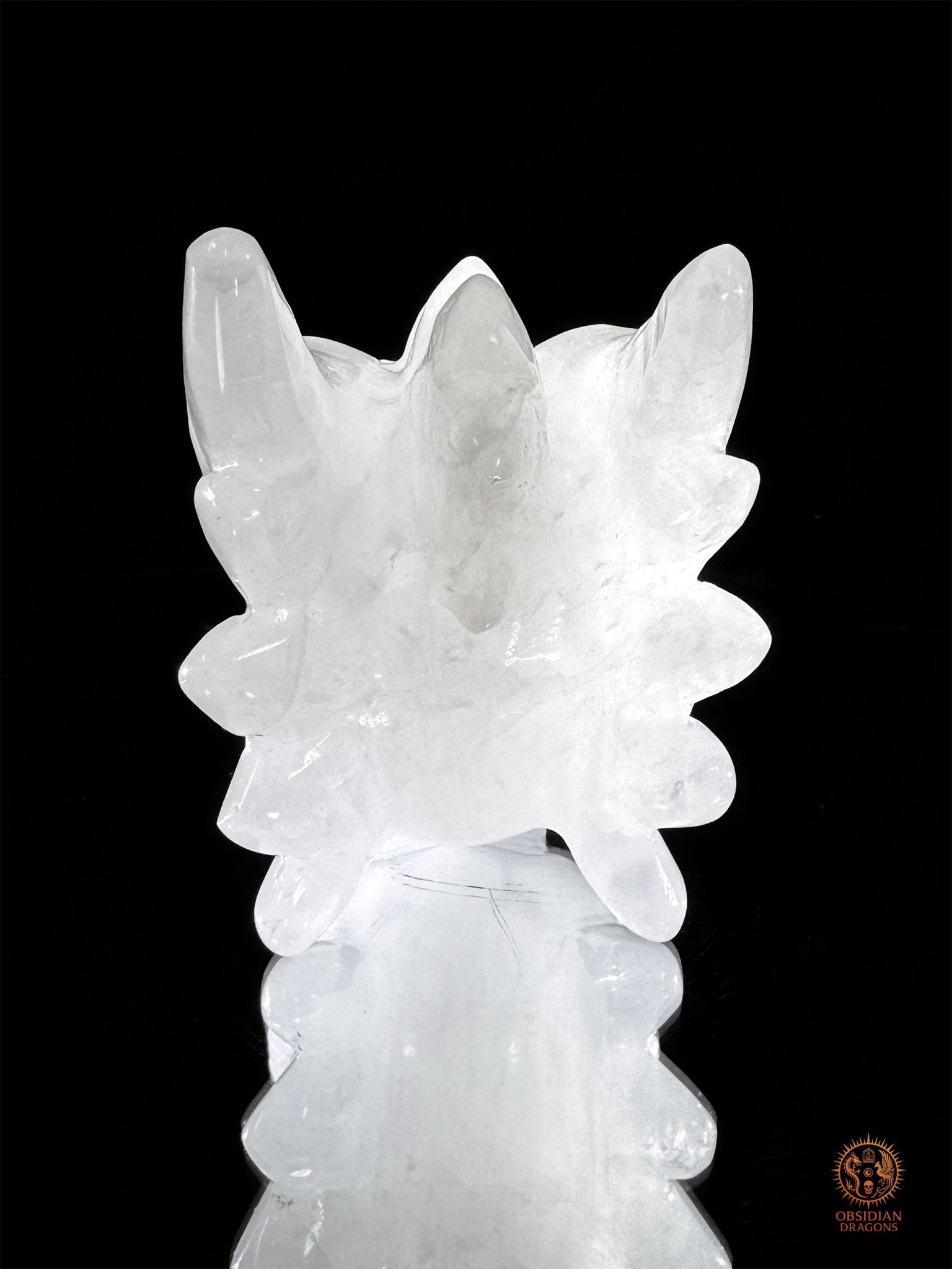 🛠️ Finition : Sculpture draconique artisanale avec reliefs d’écailles finement définis, cornes sculptées, orbites profondes et polissage brillant révélant la translucidité, les brumes internes et la structure naturelle du cristal.